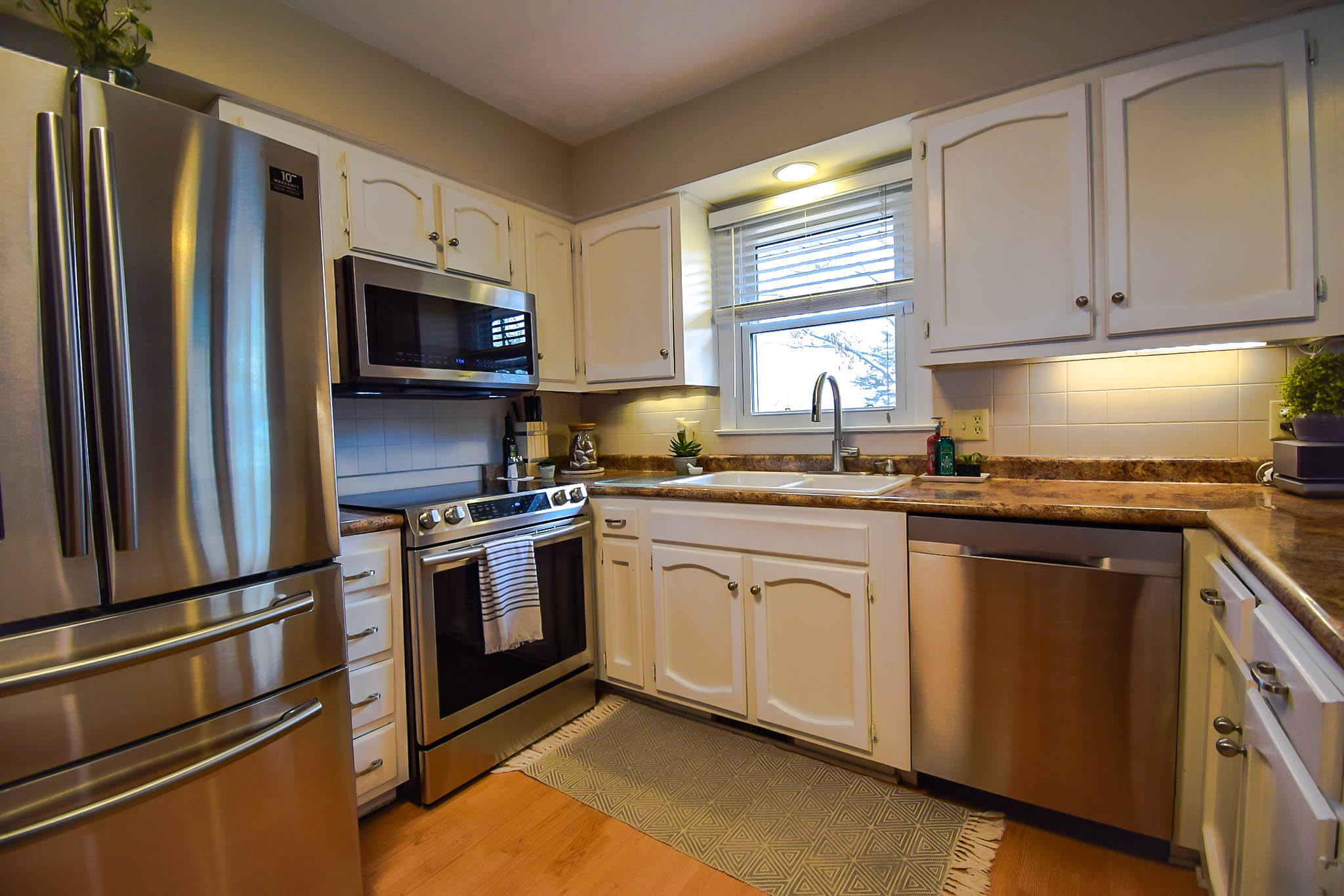 The lament tops and framing of the cabinets are a tad dated. This is a smaller space, so lightening up the look will help keep it from feeling so congested.