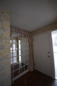 As you can see from the photos, our living room has undergone a major transformation. We started with a seriously outdated space – with good bones, but in need of some TLC. The first step was to demo. We got rid of those crazy metal wall & ceiling tiles, built-ins, carpet, and that interesting wall of mirrors. Then we opened up the wall from the entry into the living room. This brought some much-needed light into the entryway. Once demo was complete, we let the guys from Heritage Builders take over.