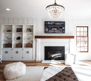 Next up, we decided to brighten things up. The team at Heritage Builders grabbed their paint brushes and started turning the walls into a stunning white canvas. Let me tell you, the difference was like night and day – the room felt bigger, brighter, and ready to make some memories with this modern family. We kept the wood window frames as is to give the windows a bit of dimension. But that wasn’t the end of our adventures! We shifted our focus to the fireplace and, with a touch of creativity, updated it with faux white brick and a custom mantel. The results? A stunning focal point that is oozing farmhouse charm and coziness.
